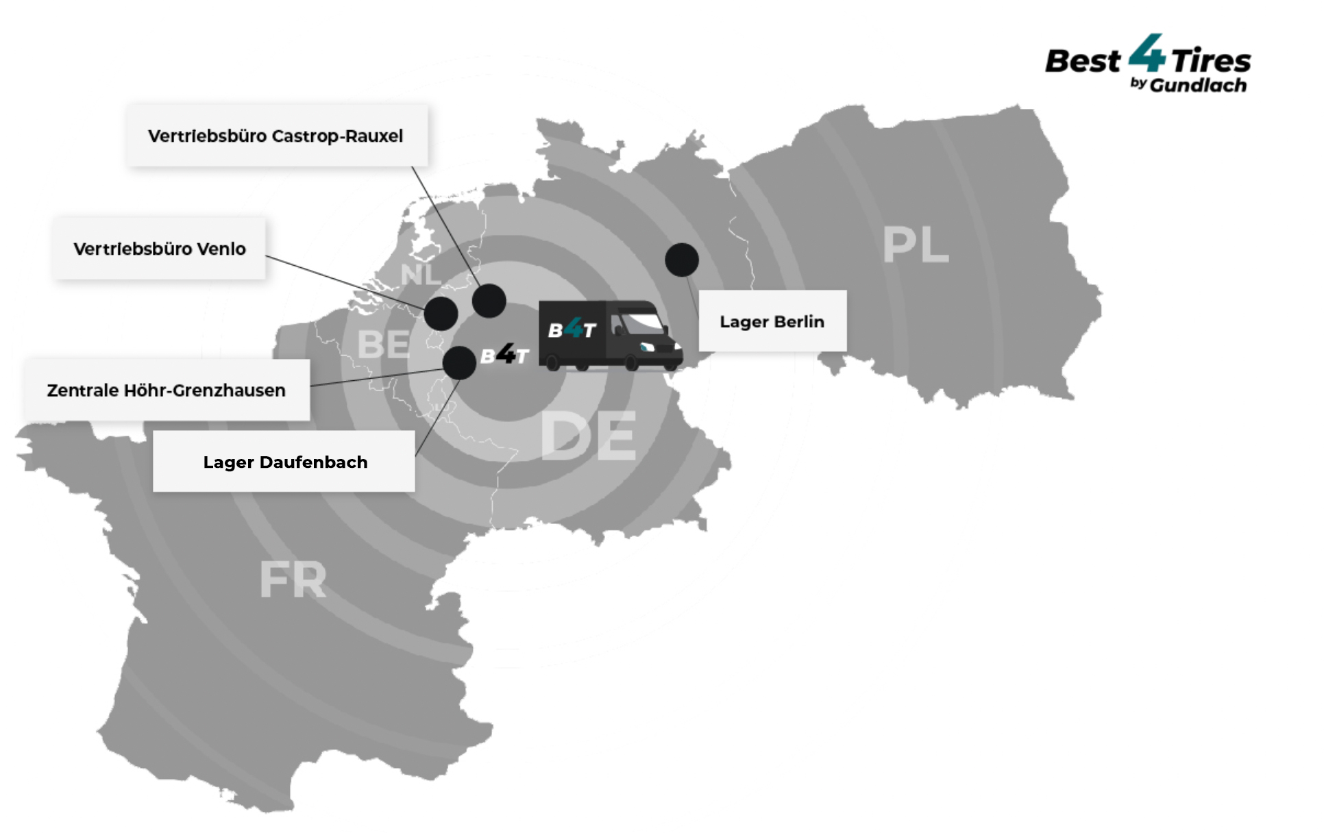 Dank der kürzlichen Akquisition des Partners 1a Berlin-Tyre mittlerweile bis an die östlichen Landesgrenzen. Ergänzt wird die kontinuierlich weiterwachsende Abdeckung um unsere Präsenzen in den Metropolregionen Berlin, Hamburg und München.